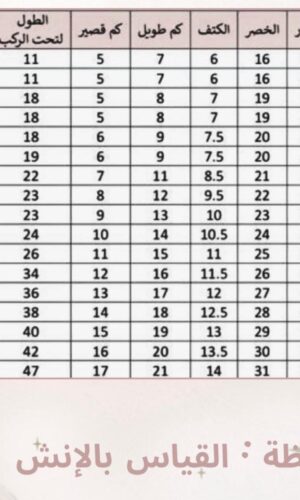 ملحوظة: المقاسات للقطعة وليس مقاس الجسم